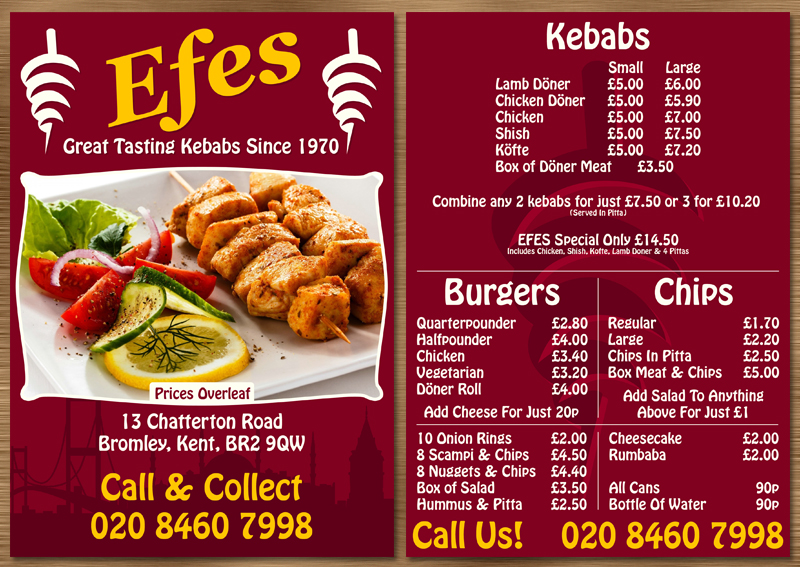 Efes Kebabs are a well established independant restaurant in Bromley that opened in 1970.
